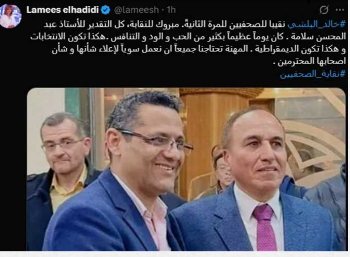“خالد البلشي نقيبًا للصحفيين للمرة الثانية.. مبروك للنقابة، كل التقدير للأستاذ عبدالمحسن سلامة. كان يومًا عظيمًا بكثير من الحب والود والتنافس”.