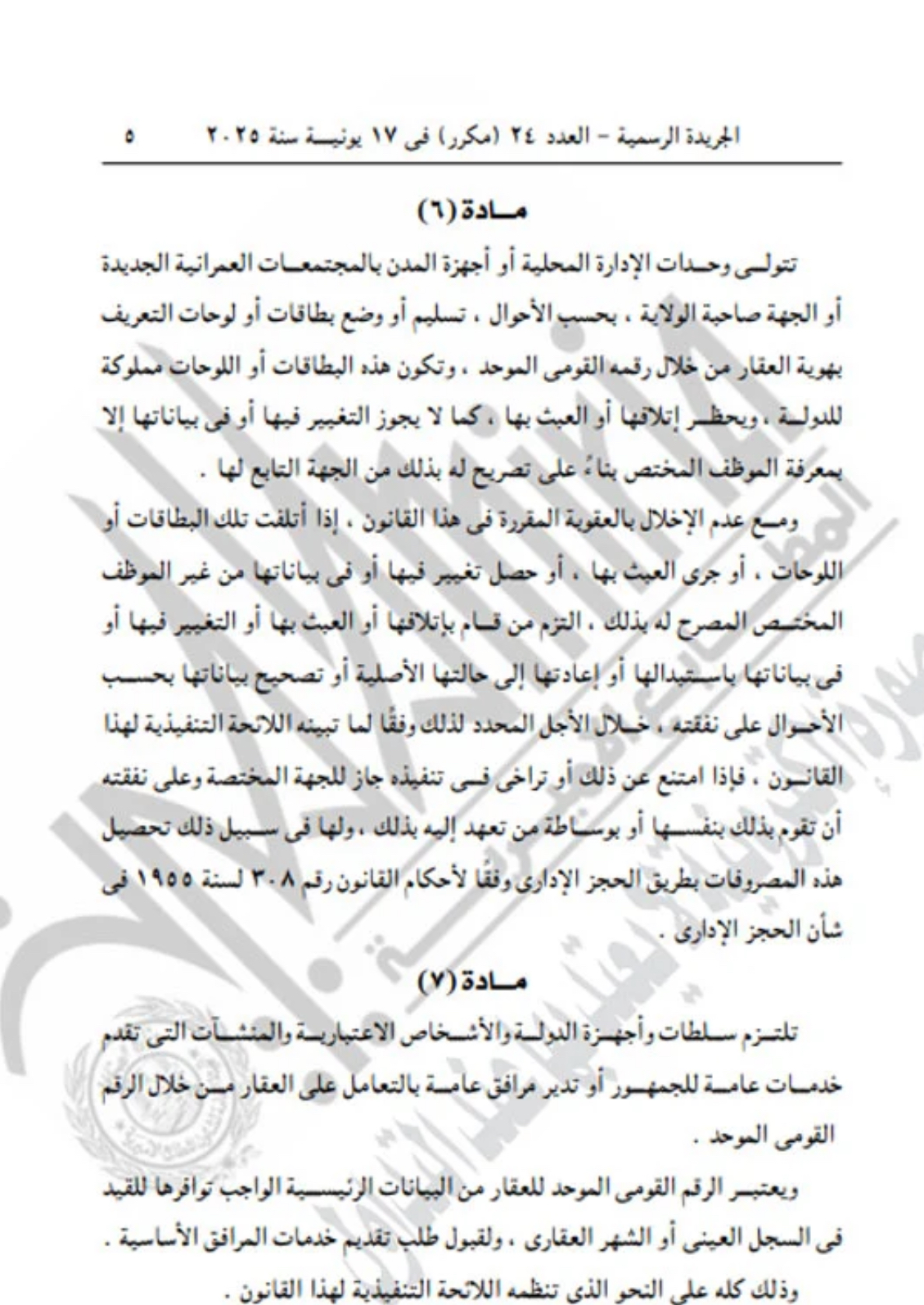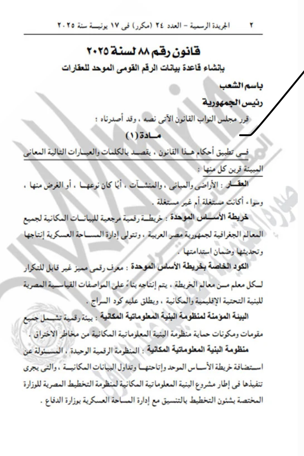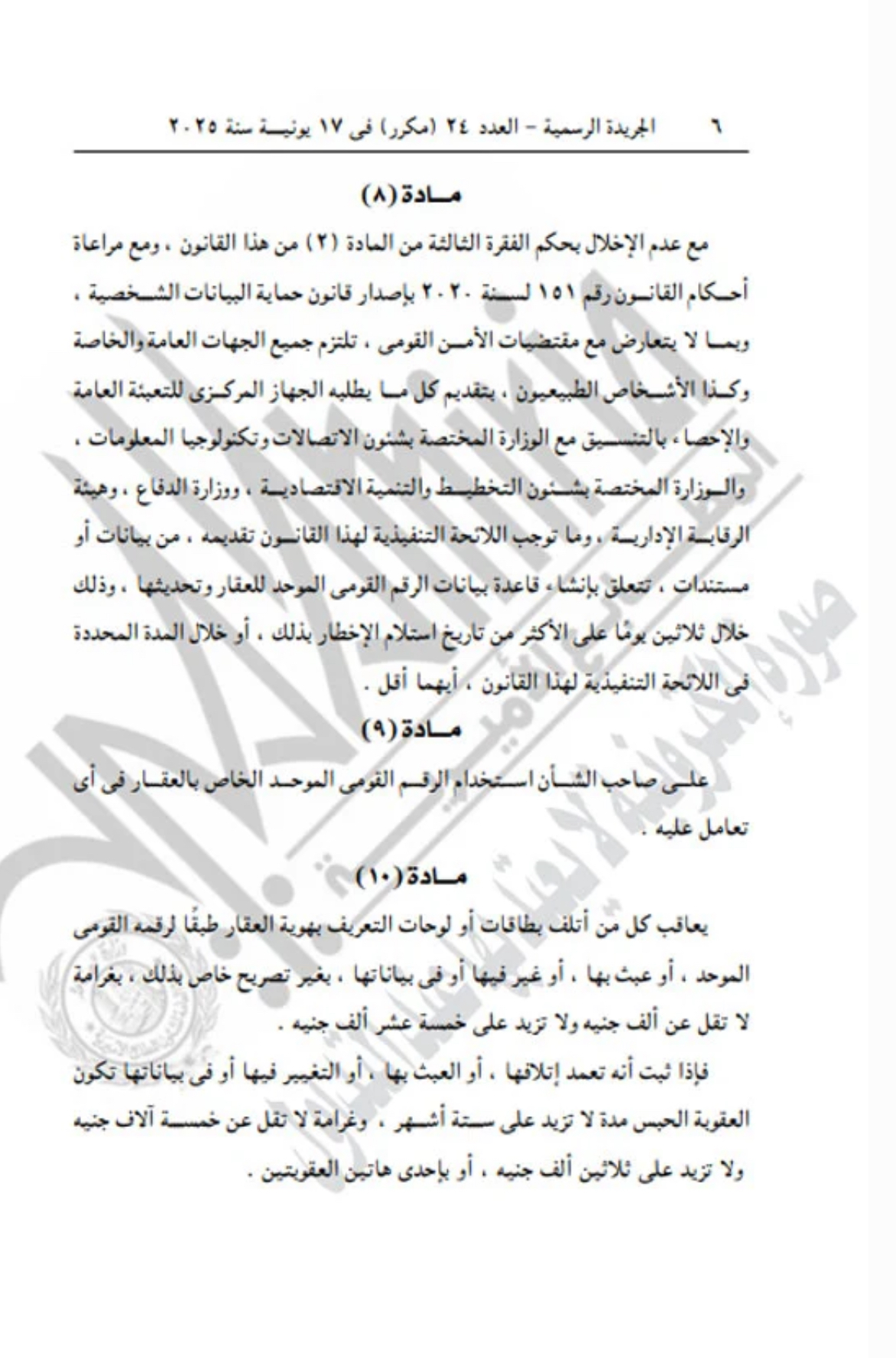ويهدف القانون إلى ضبط ملكية العقارات وتوحيد قواعد البيانات العقارية على مستوى الجمهورية، من خلال تخصيص رقم قومي موحد وغير قابل للتكرار لكل عقار، يتم ربطه بخريطة الأساس الموحدة لجمهورية مصر العربية داخل بيئة إلكترونية مؤمنة.