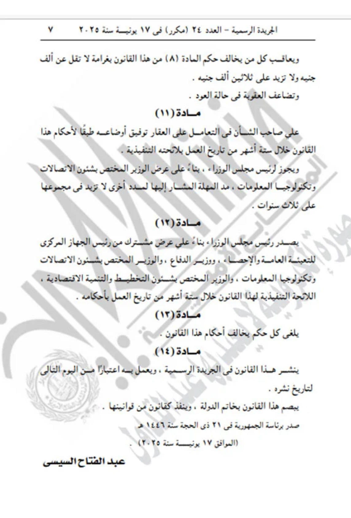 نشرت الجريدة الرسمية، في عددها الصادر اليوم، تصديق الرئيس عبد الفتاح السيسي على القانون رقم 88 لسنة 2025 بشأن إنشاء قاعدة بيانات الرقم القومي الموحد للعقارات، وذلك بعد موافقة مجلس النواب عليه رسميًا.