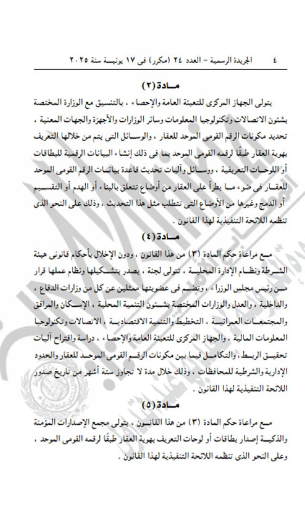 يتولى الجهاز المركزي للتعبئة العامة والإحصاء، بالتنسيق مع وزارة الاتصالات والجهات المعنية، تحديد مكونات الرقم القومي للعقار، وإنشاء وتحديث البيانات الرقمية الخاصة باللوحات أو البطاقات التعريفية.