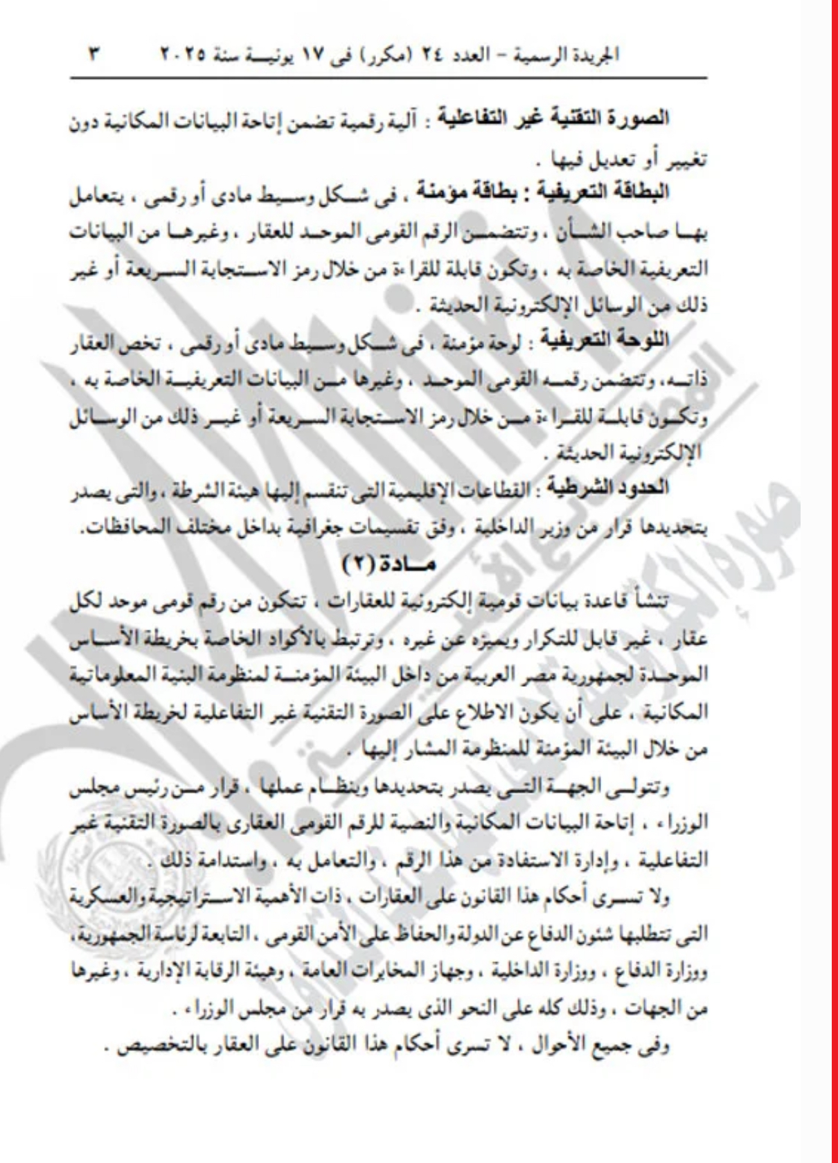 تنشأ قاعدة بيانات قومية إلكترونية للعقارات تتضمن رقمًا قوميًا موحدًا، يُميز كل عقار، ويُخزن في البيئة المؤمنة للبنية المعلوماتية المكانية.