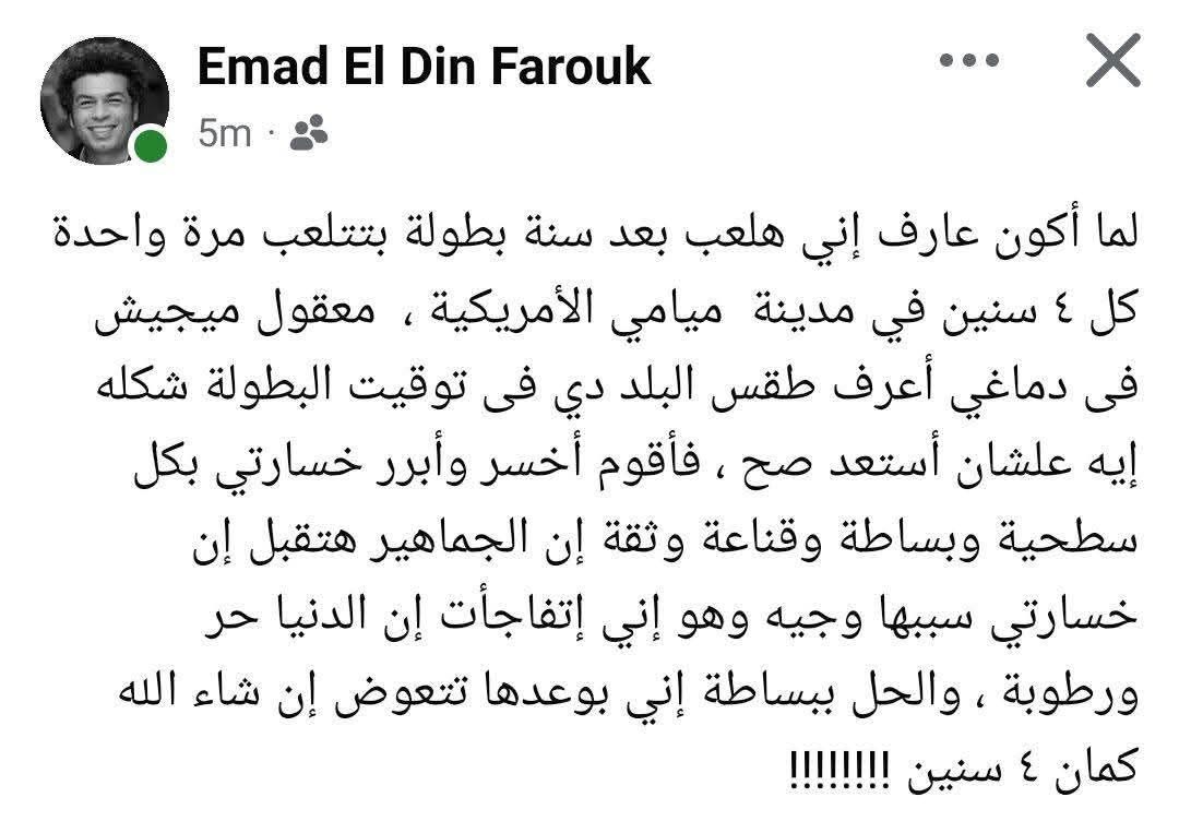 وكتب المُعد النفسي السابق للنادي الأهلي عبر حسابه الشخصي على موقع فيسبوك منشورًا قال فيه:“لما أكون عارف إني هلعب بعد سنة بطولة بتتلعب مرة واحدة كل ٤ سنين في مدينة ميامي الأمريكية، معقول ميجيش في دماغي أعرف طقس البلد دي في توقيت البطولة شكله إيه علشان أستعد صح؟ فأقوم أخسر وأبرر خسارتي بكل سطحية وبساطة وقناعة وثقة إن الجماهير هتقبل إن خسارتي سببها وجيه وهو إني اتفاجأت إن الدنيا حر ورطوبة، والحل ببساطة إني بوعدها تتعوض إن شاء الله كمان ٤ سنين !!!!!!!!”