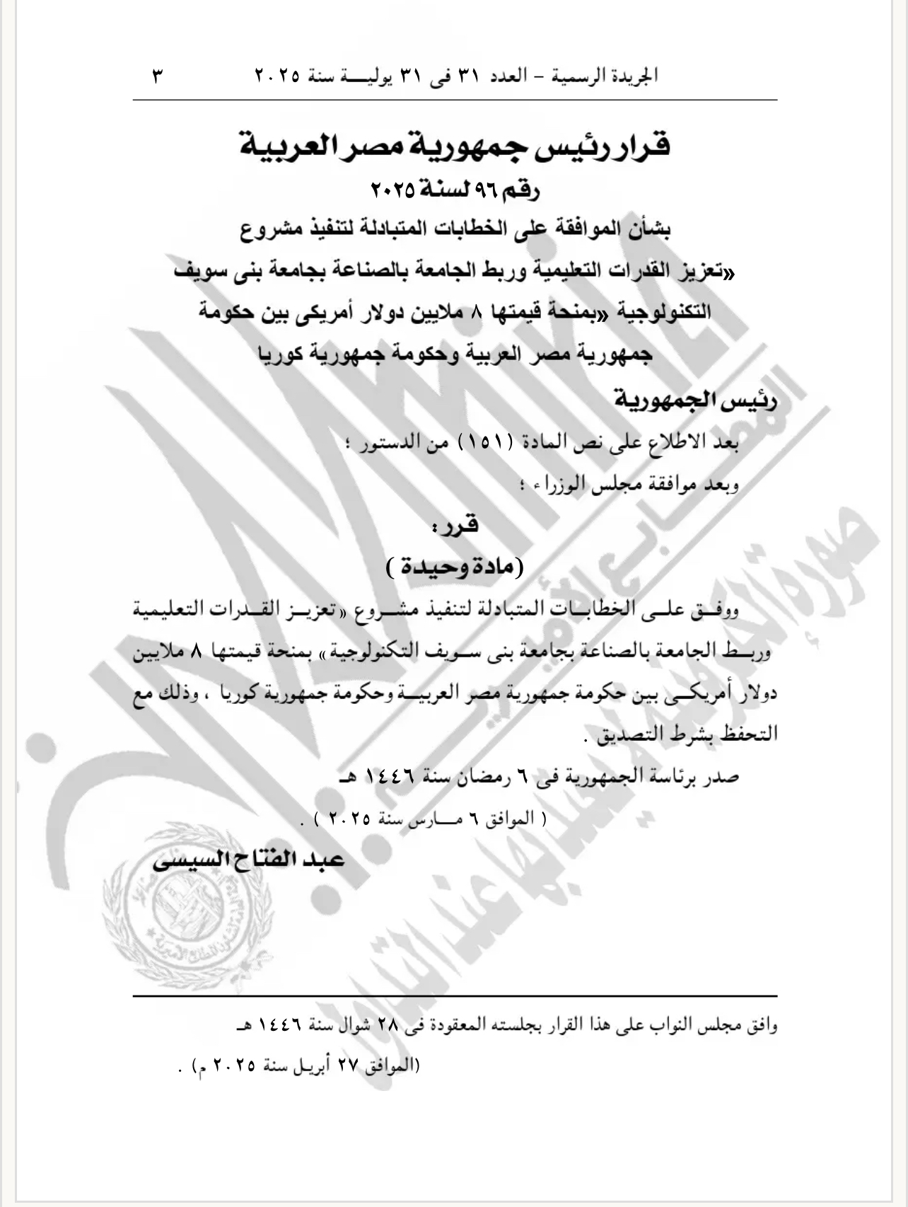 نشرت الجريدة الرسمية في عددها رقم 31 الصادر اليوم الخميس 31 يوليو 2025، قرار الرئيس عبد الفتاح السيسي رقم 96 لسنة 2025، بشأن الموافقة على الخطابات المتبادلة بين حكومتي مصر وكوريا الجنوبية لتنفيذ مشروع “تعزيز القدرات التعليمية وربط الجامعة بالصناعة بجامعة بني سويف التكنولوجية”، وذلك بمنحة مقدمة من الحكومة الكورية تبلغ 8 ملايين دولار أمريكي.