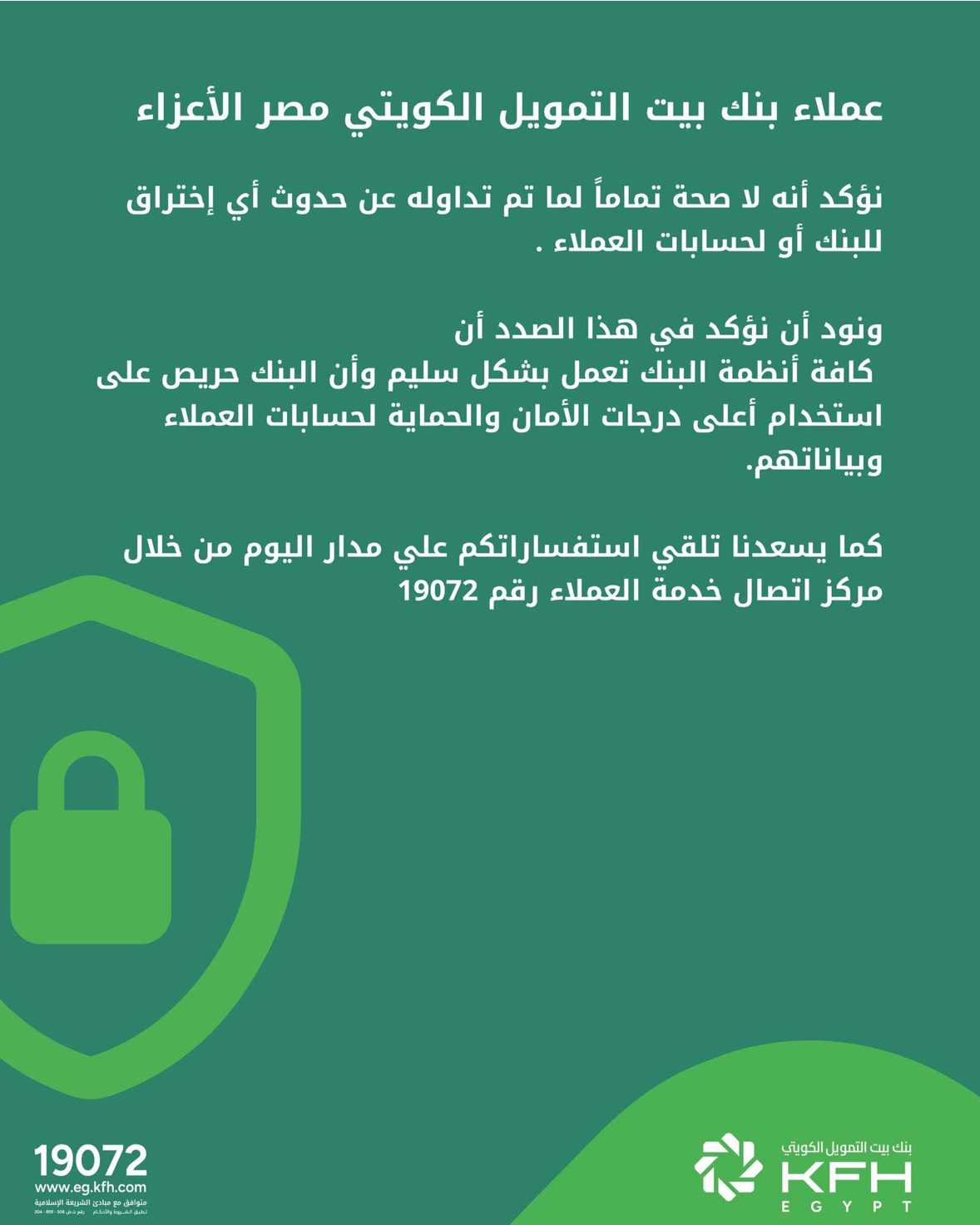 بيت التمويل الكويتي – مصر ينفي تعرض أنظمته أو حسابات العملاء للاختراق