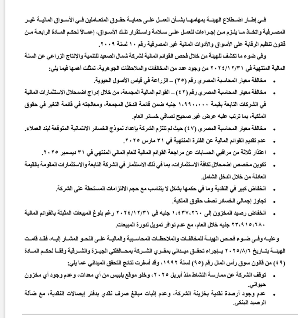 • مخالفة معيار المحاسبة المصرية رقم 35 بشأن قياس الأصول الحيوية، ورقم 42 بعد إدراج اضمحلال الاستثمارات المالية في الشركات التابعة بقيمة 1.99 مليون جنيه في قائمة الدخل بدلًا من قائمة التغير في حقوق الملكية، ما أدى إلى عرض غير صحيح لصافي خسائر العام.