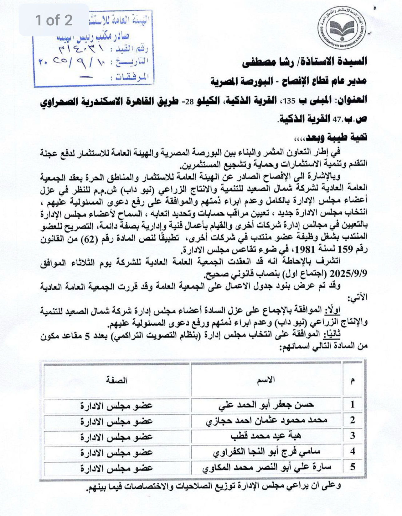 وانتخبت الجمعية العمومية مجلس إدارة جديد مكون من 5 أعضاء، وهم: حسن جعفر علي، ومحمد محمود حجازي، وهبه عيد قطب، وسامي فرج الكفراوي، وسارة علي المكاوي. كما وافقت الجمعية على السماح لأعضاء المجلس بالتعيين في مجالس إدارة شركات أخرى والقيام بأعمال فنية وإدارية، والسماح للعضو المنتدب بشغل وظيفة عضو منتدب في شركات أخرى.