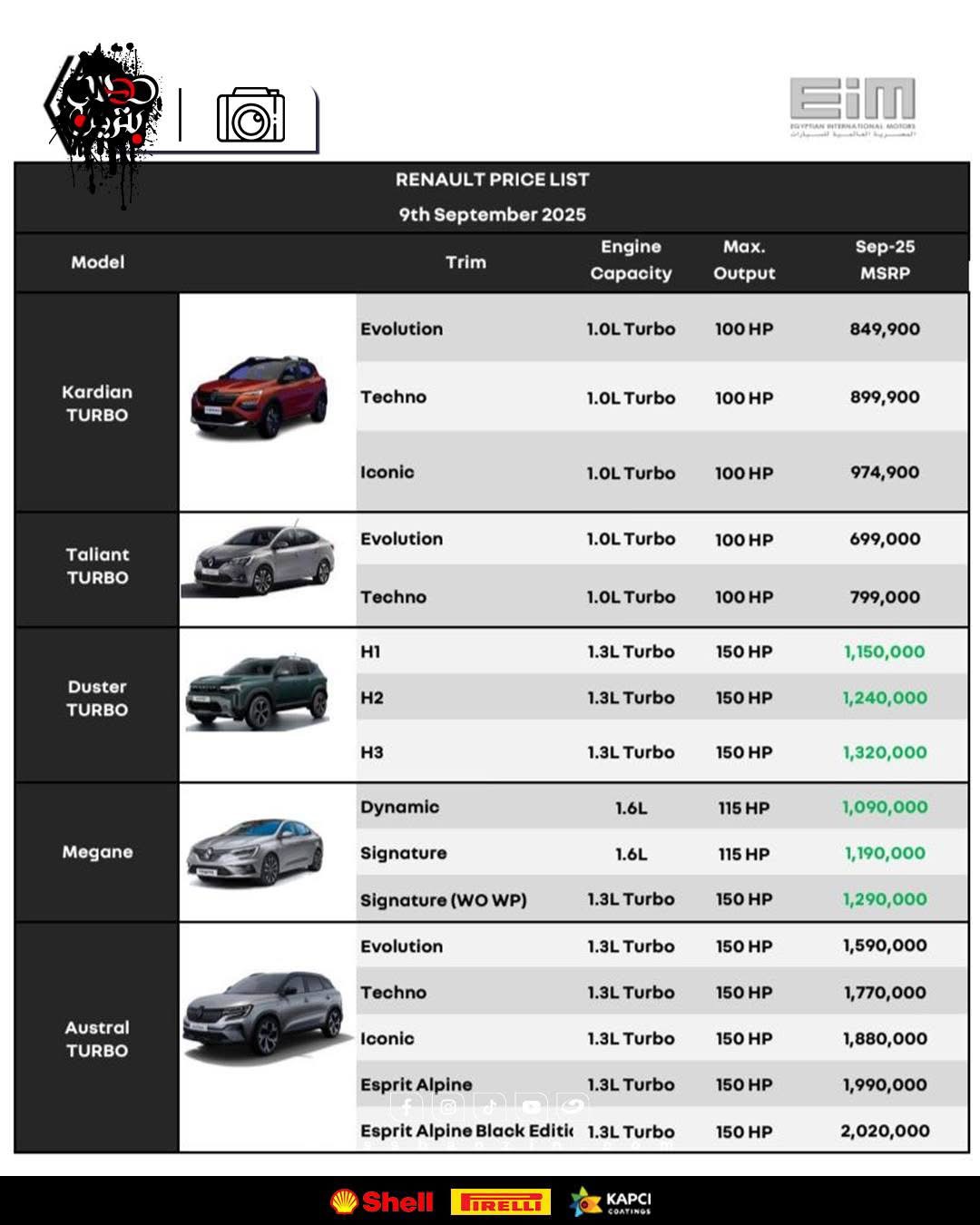 • رينو أوسترال TURBO: تبدأ من 1,590,000 جنيه لفئة Evolution، وتصل إلى 2,020,000 جنيه للفئة الأعلى Esprit Alpine Black Edition.