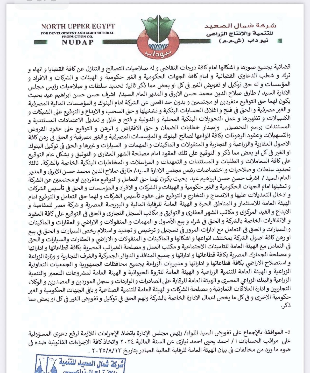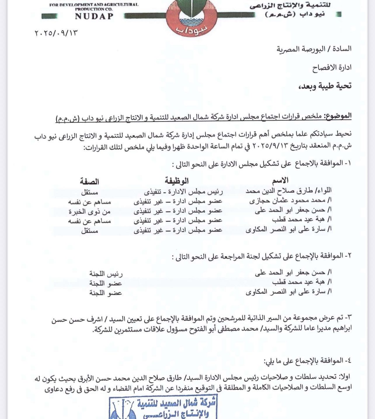 اعتمدت شركة شمال الصعيد للتنمية والإنتاج الزراعي (نيوداب) تشكيل مجلس إدارة جديد، وذلك عقب قرار الجمعية العامة بعزل المجلس السابق وعدم إبراء ذمته ورفع دعوى مسؤولية عليه.