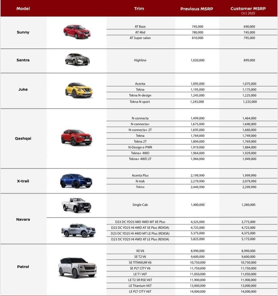 أعلنت شركة نيسان إيجيبت، الوكيل والمصنّع الرسمي لسيارات نيسان اليابانية في مصر، عن قائمة أسعار جديدة تشمل تخفيضات كبيرة على جميع طرازاتها باستثناء سيارة “باترول”، في خطوة تعكس تنافسًا قويًا في سوق السيارات خلال الربع الأخير من عام 2025.