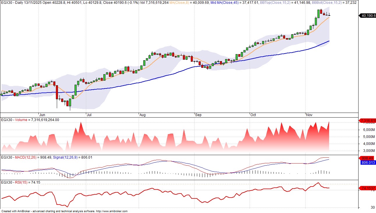 قدّم سامح غريب، مدير قسم كبار العملاء بشركة عربية أون لاين لتداول الأوراق المالية، رؤية فنية حول تحركات المؤشر الرئيسي EGX30 خلال الأسبوع الماضي، بعد أن فقد المؤشر معظم مكاسبه ليغلق عند 40190 نقطة مقارنة بقمته الأسبوعية عند 40951 نقطة.