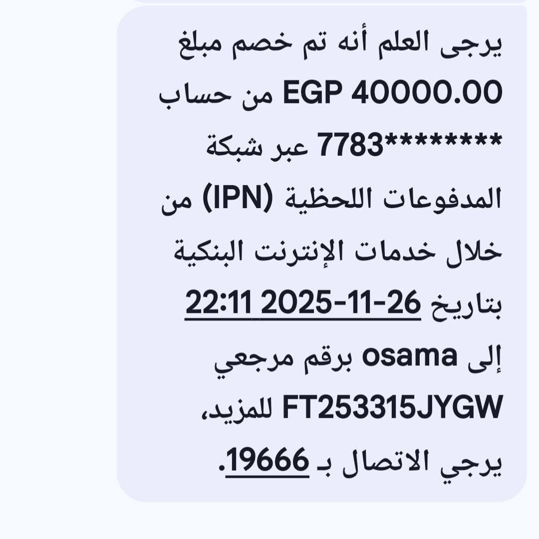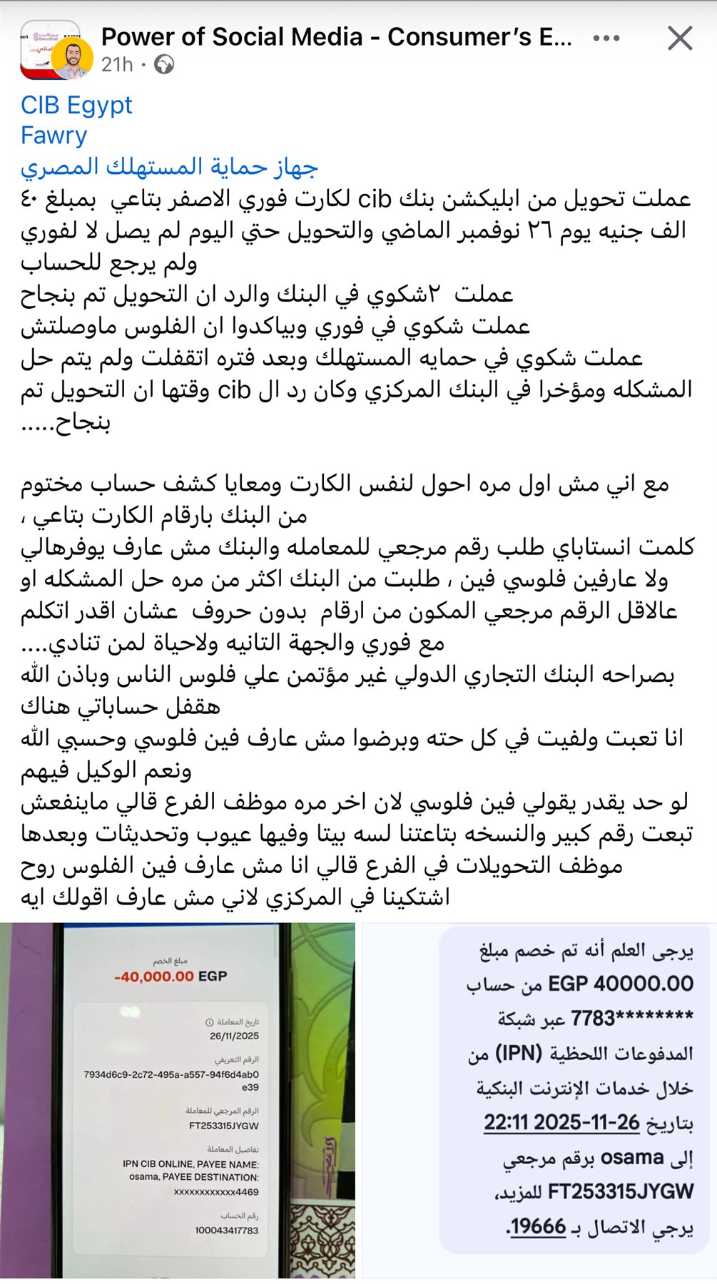 تقدمت عميلة بشكوى رسمية إلى البنك التجاري الدولي (CIB Egypt) وشركة فوري وجهاز حماية المستهلك المصري، بعد تحويل مبلغ 40 ألف جنيه من تطبيق البنك إلى كارت فوري الأصفر الخاص بها يوم 26 نوفمبر 2025، إلا أن الأموال لم تصل حتى الآن، ولم تُسترجع إلى حسابها.