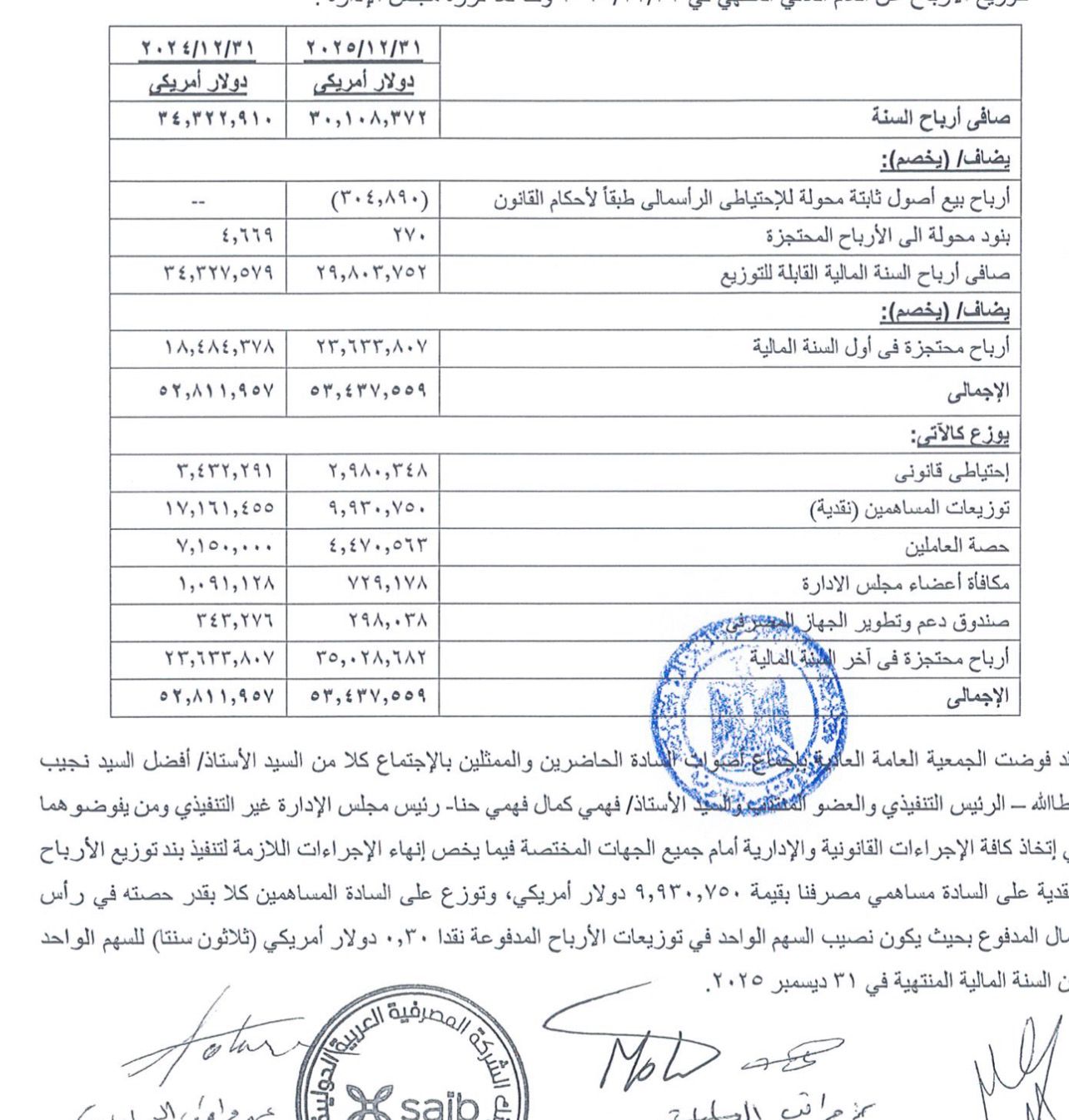 أعلن بنك الشركة المصرفية العربية الدولية (SAIB) أن الجمعية العامة العادية، المنعقدة في 17 مارس 2026، وافقت بالإجماع على تفويض كل من الرئيس التنفيذي والعضو المنتدب، ورئيس مجلس الإدارة غير التنفيذي، في اتخاذ كافة الإجراءات القانونية والإدارية اللازمة لتنفيذ قرار توزيع الأرباح النقدية على المساهمين.