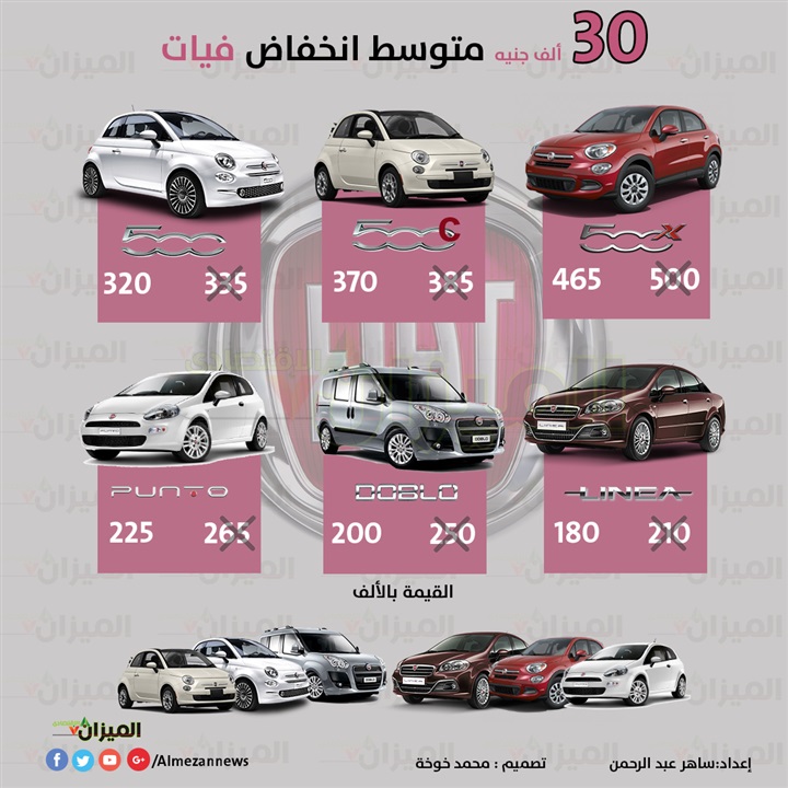 30 ألف جنيه متوسط انخفاض فيات الإثنين 24/أبريل/2017 - 12:44 م 4/24/2017 12:44:00 PM صورة ارشيفية جريدة الميزان فيات سيارات أخبار الرياضة