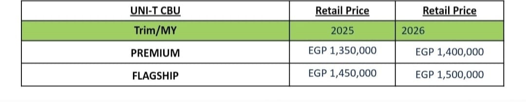 وبحسب القائمة السعرية المعلنة، جاء سعر فئة Premium من «شانجان Uni-T» موديل 2026 عند 1.4 مليون جنيه بدلًا من 1.35 مليون جنيه لموديل 2025، بينما سجلت فئة Flagship نحو 1.5 مليون جنيه مقابل 1.45 مليون جنيه لموديل العام السابق.
