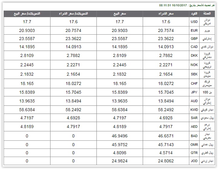 أسعار العملات الأجنبية بـ«البنك الأهلي» اليوم الإثنين 16/أكتوبر/2017 - 10:44 ص 10/16/2017 10:44:57 AM خاص الميزان الدولار ننشر أسعار العملات الأجنبية والعربية بالبنك الأهلي المصري خلال تعاملات اليوم الاثنين الموافق 16 - 10 - 2017. اليورو العملات العربية العملات الاجنبية الدولار
